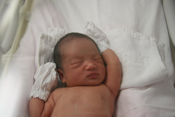 Dr Chan 助手攞妹妹出來時話佢好標緻, 真係? 不過聽到佢喊得好大聲, 已經消除咗其中一樣早產嬰有肺功能未完全成熟嘅憂慮, 好彩仲有 5.5 lb, 姑娘抱過來比我見時我最緊張佢手指腳趾齊全, 同埋係咪雙眼皮, kaka~~